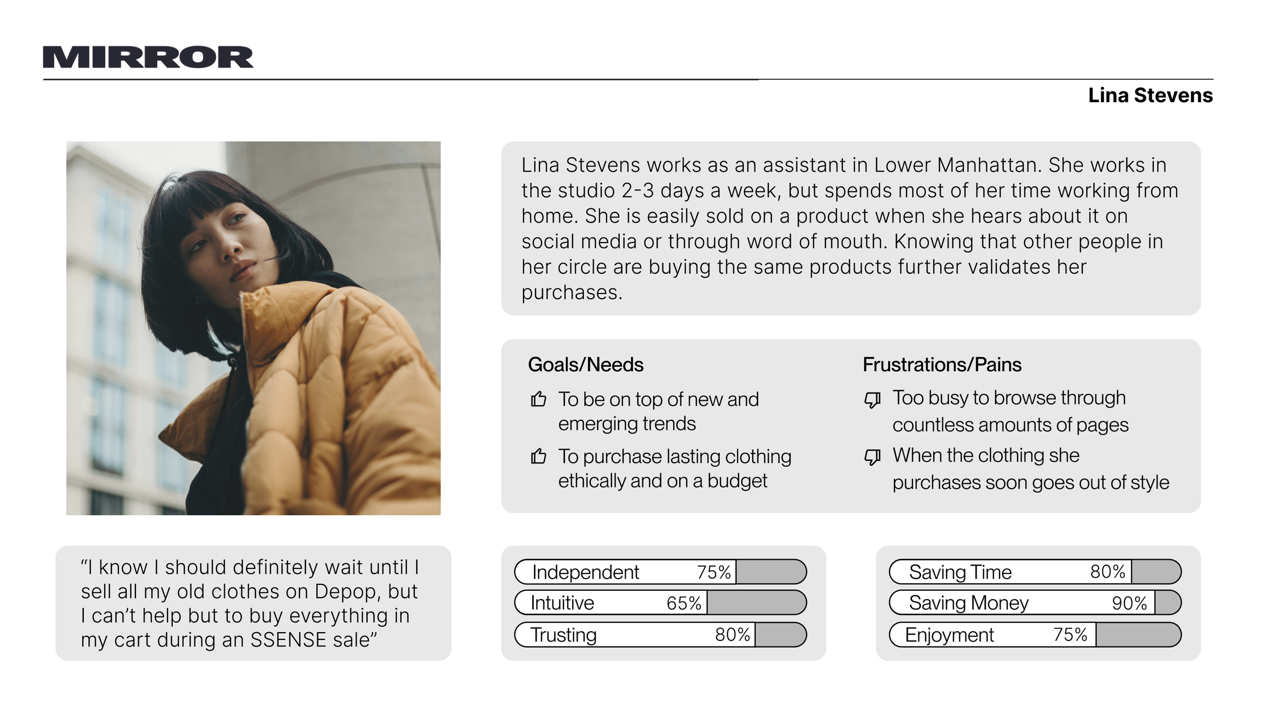 To further understand the frustrations and desires of the average Mirror customer, I created a User Persona based on an accumulation of all my research.