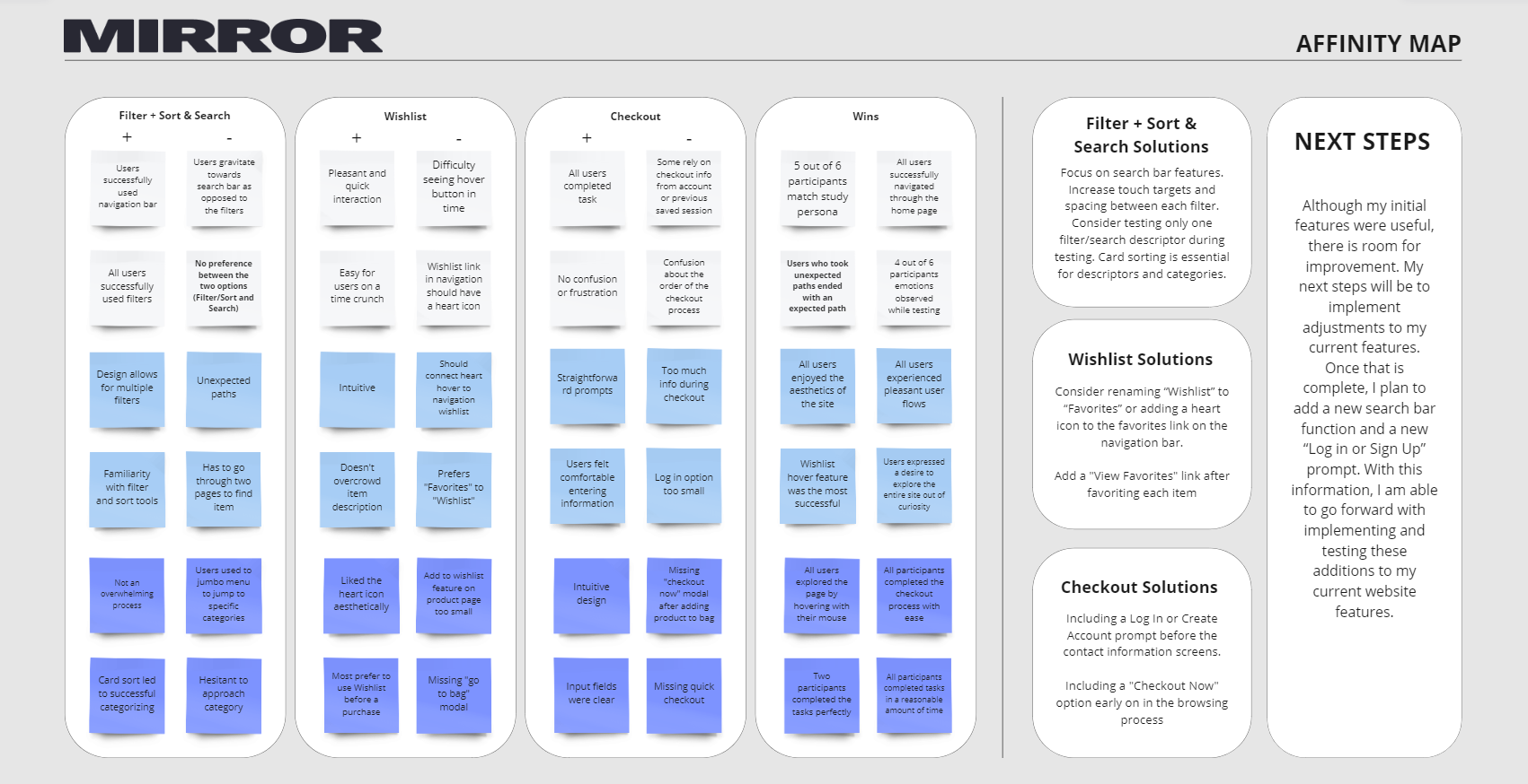The affinity map allowed me to identify achievements and improvements within these three categories