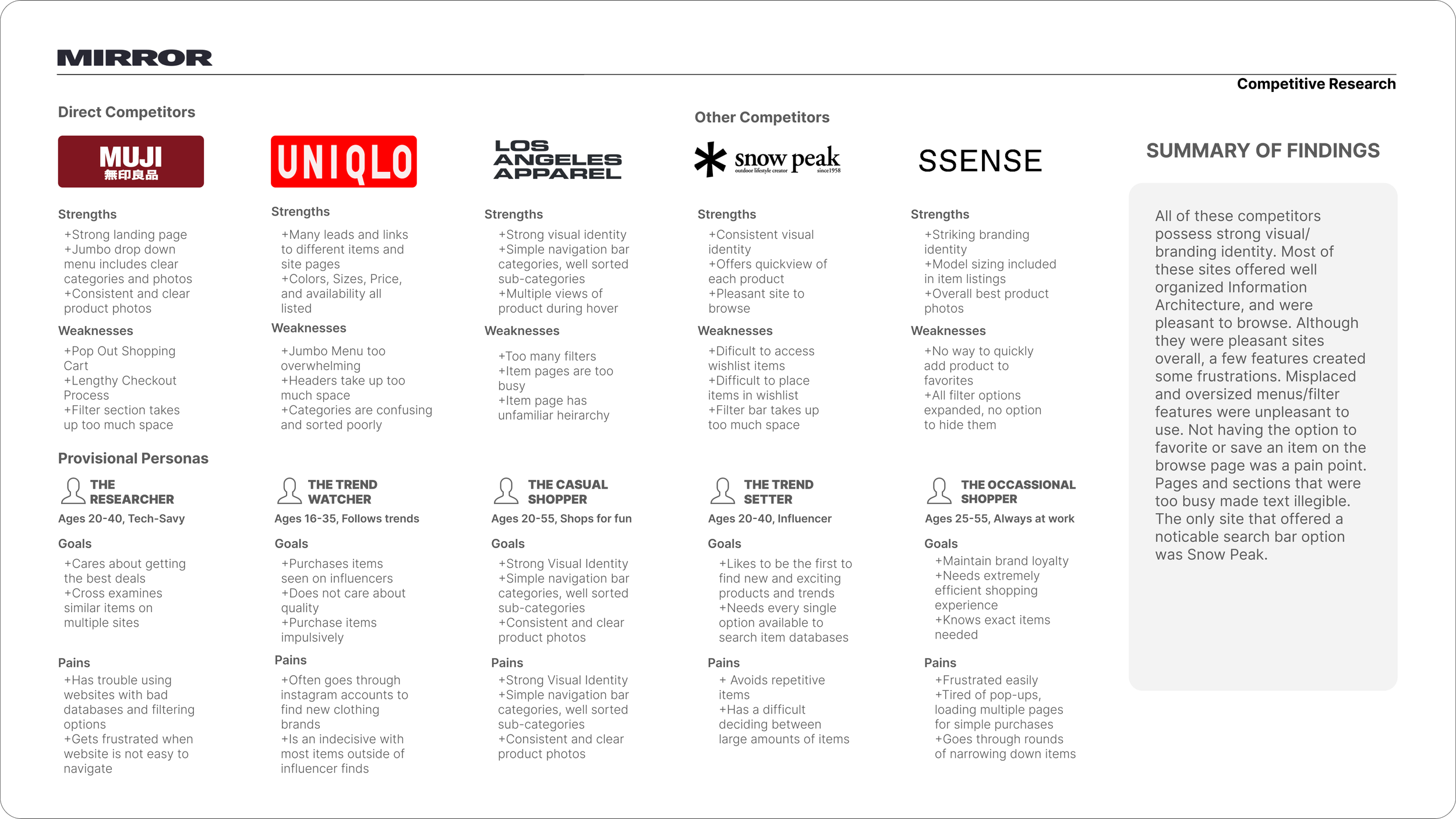 By examining the strengths and weaknesses of several different e-commerce competitors, I saw that competitive price, quality, and brand identity are among the most significant factors of a successful clothing company. This research also allowed me to create preliminary personas.
