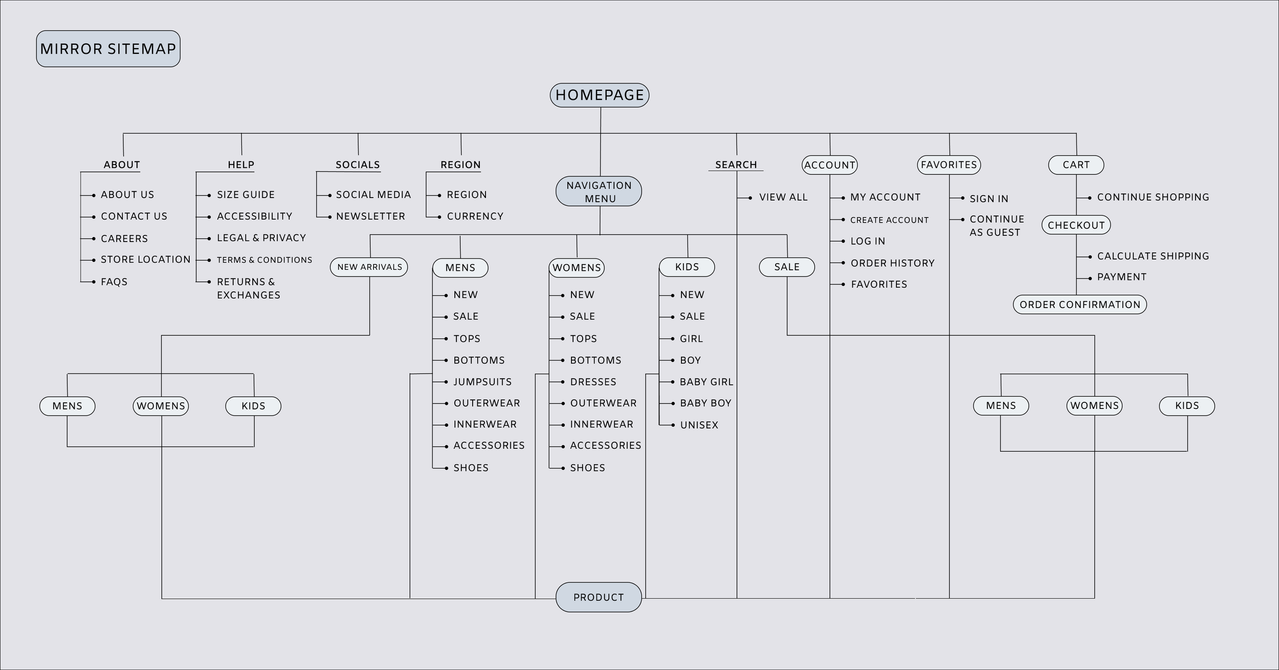 Prior to creating low-fidelity wireframes, I mapped out the webpages of Mirror and their relationships to one another. With help from a card-sort study and competitive research, I was able to create a categorization method that proves to be efficient and logical.